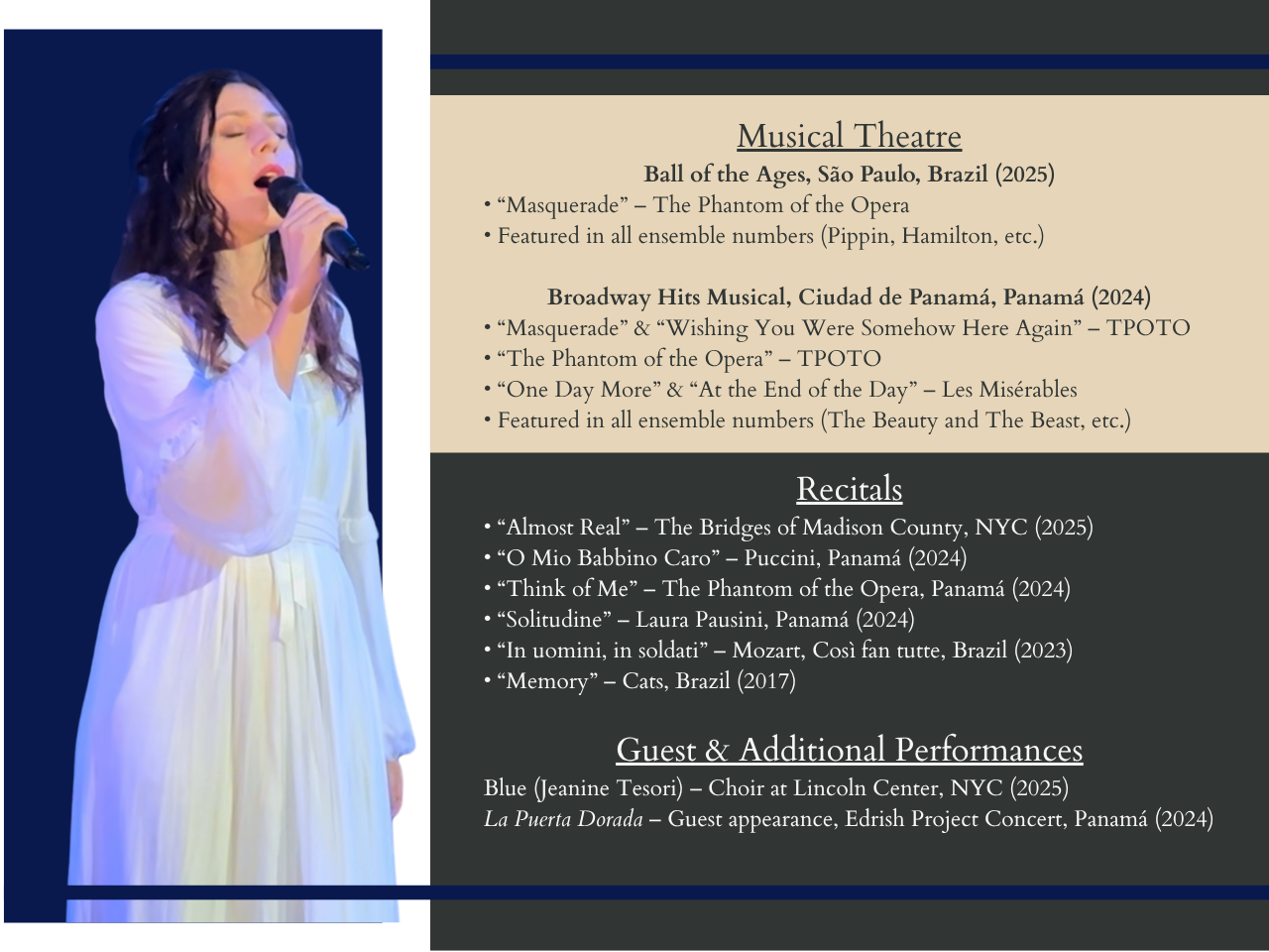Beyond the stage, I remain a multidisciplinary creative constantly exploring the intersection of art, aesthetics, and experience. My visual background influences the way I perform, shaping my sense of movement, presence, and character. Whether I’m singing, acting, or composing, my purpose is to create moments that resonate, inspire, and leave a lasting impression.